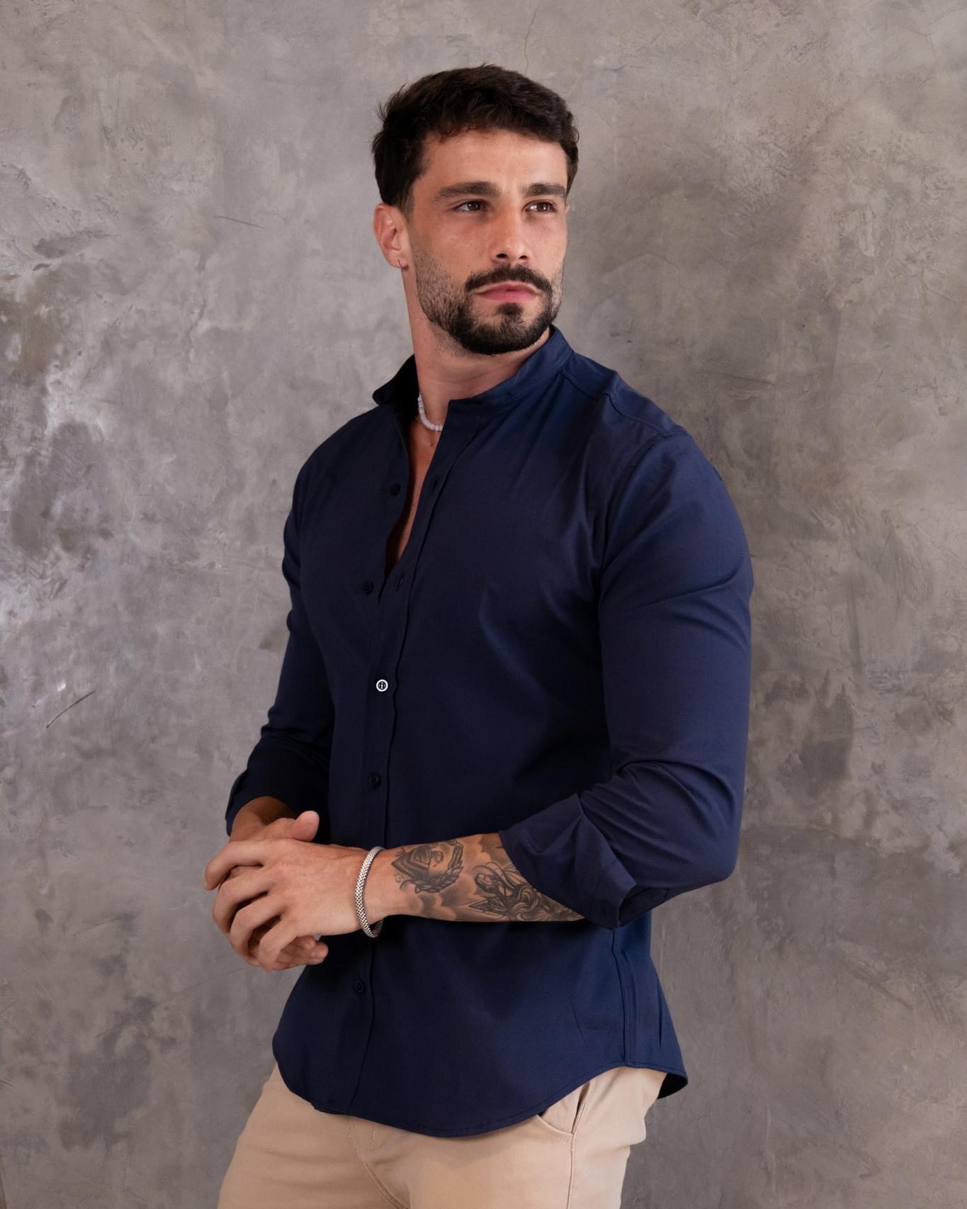 Camisa Azul Marinho Manga Longa - Gola Padre